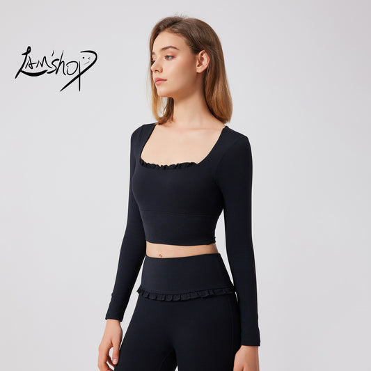 Lamshop autumn and winter nude lace yoga clothes long sleeves semi-fixed cup running slim sports bra breathable gym clothes top
