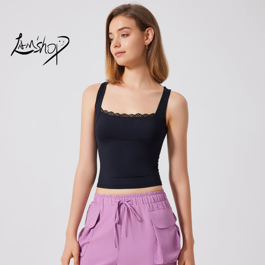 Lamshop beautiful back sports vest women's nude lace yoga clothes double layer T-shirt outside breathable running fitness top
